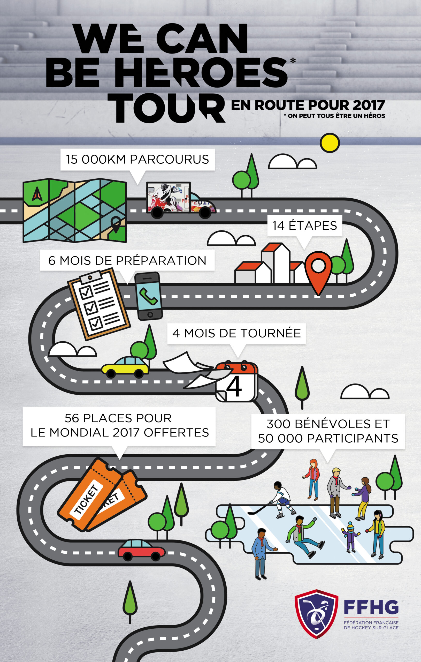 Avec 14 étapes dans les 14 villes des clubs de Ligue Magnus, le We Can Be Heroes Tour a effectué un tour de France du hockey dans le but de promouvoir le Championnat du Monde 2017. Débutée le 10 octobre à Rouen, la tournée menée par Oscar, la mascotte de l’équipe de France, s’est achevée ce mardi 2 février 2016 à Briançon. Retour en infographie sur cette belle aventure fédératrice pour la famille du hockey sur glace…