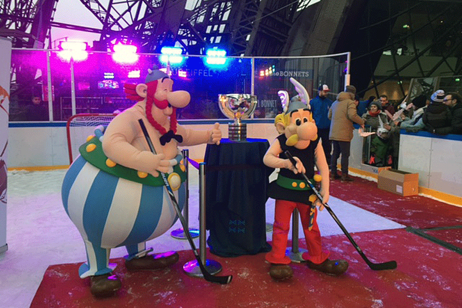 Ce samedi 7 janvier 2017, les mascottes du Championnat du Monde de Hockey sur Glace 2017 de l’IIHF – Astérix et Obélix – se sont invitées au première étage de la Tour Eiffel, où se trouve la patinoire habillée aux couleurs de la compétition. À cette occasion, Astérix et Obélix ont présenté au public de Tour Eiffel, ainsi qu’aux jeunes hockeyeurs présents pour les initiations, le Trophée du Championnat du Monde 2017. Dans ce cadre exceptionnel, les mascottes ont pris des photos avec les visiteurs, certains fans et d’autres novices en matière de Hockey sur Glace.