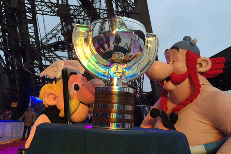 Astérix et Obélix se sont présentés en début d’après-midi samedi, au premier étage de la Tour Eiffel. À ce moment-là avait lieu les initiations au Hockey sur Glace encadrées par des entraîneurs diplômés sur la patinoire de 200m2 aux couleurs de la compétition. Pour l’occasion, tous les enfants présents pour la séance de découverte avaient revêtu le maillot de l’Équipe de France. Après avoir salué les visiteurs du premier étage de la Tour, les mascottes du Championnat du Monde de Hockey sur Glace 2017 de l’IIHF ont osé fouler la glace ! Ce fut l’occasion pour eux de dévoiler le Trophée du Championnat du Monde 2017, dans un cadre exceptionnel et insolite, à 57m au-dessus du sol, pour le plus grand bonheur des petits et des grands.