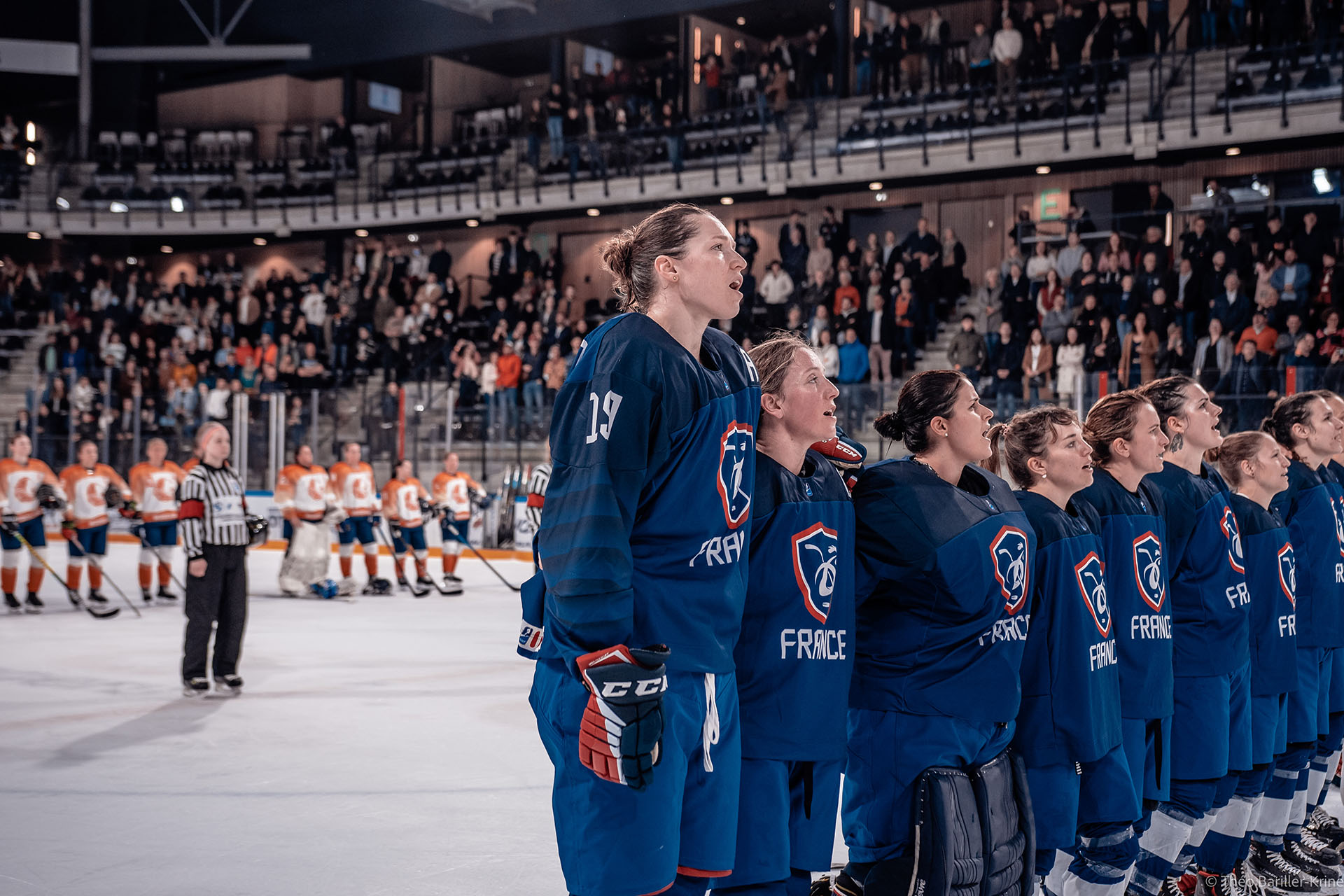 Lore Baudrit et Marion Allemoz en pleine Marseillaise après la rencontre face au Pays-Bas lors du Mondial d’Angers (Crédit : Théo Bariller-Krine)