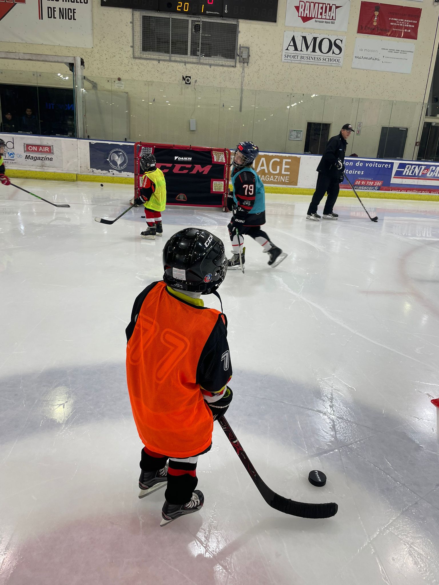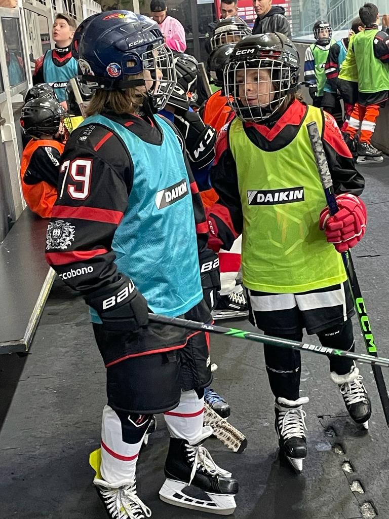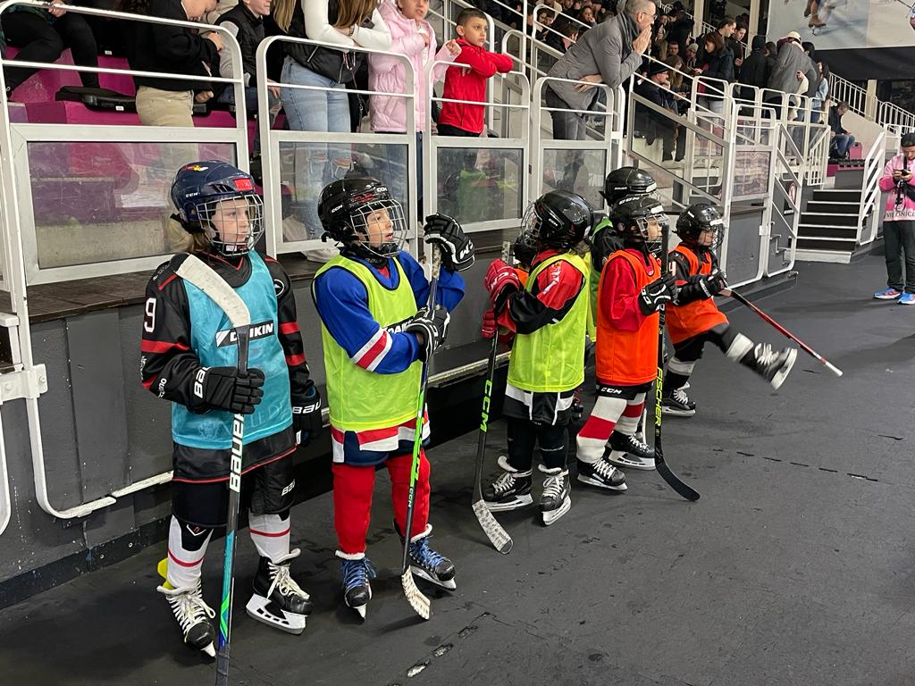 C’est dans le cadre de la rencontre de la Synerglace Ligue Magnus opposant les Aigles de Nice à l’Anglet Hormadi que s’est tenue la quatrième remise du Daikin Ice Club 2023. Les enfants de l’école de hockey (U7, U9, U11, U13) ont tout d’abord accompagné les joueurs sur la glace avant le coup d’envoi fictif donné par Pascal Brisciano, représentant de Daikin Nice. Toujours vêtus de leurs chasubles aux couleurs de Daikin, les enfants ont participé à chaque tiers au Daikin Challenge en tentant de marquer le maximum de buts dans les cages équipées des bâches techniques fournies par Daikin.
