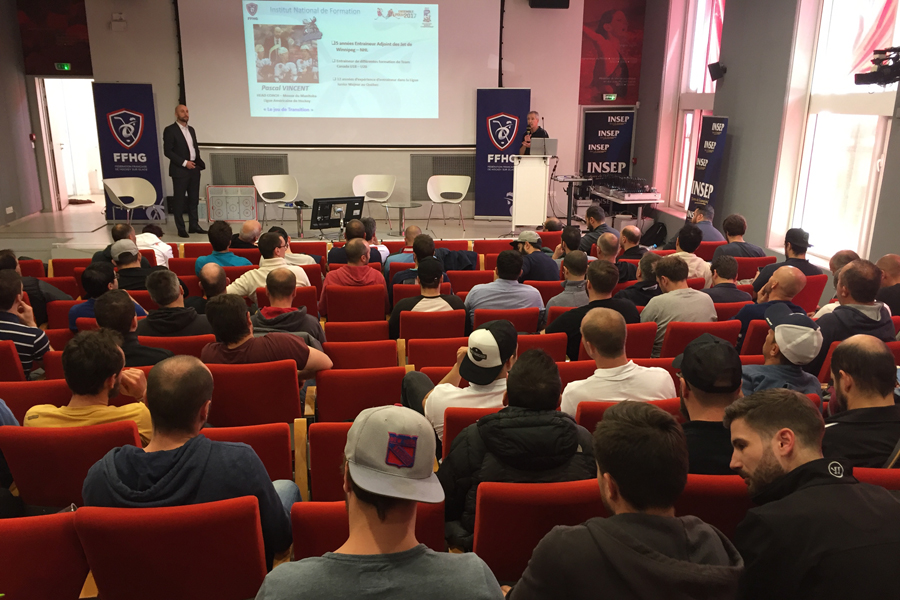 Du vendredi 12 au dimanche 14 mai 2017, l’Institut National de Formation a organisé la Formation Continue Nationale des entraîneurs à Paris, parallèlement au Championnat du Monde de Hockey sur Glace 2017 de l’IIHF. Au cours du week-end, les entraineurs du PES (Parcours d’Excellence Sportive) et 156 techniciens du hockey mineur – un record ! – ont été accueillis en bénéficiant des installations de l’INSEP pour suivre les formations (détails). Les participants ont pu profiter des matches du CM2017 à l’AccorHotels Arena chaque soir après les interventions menées par des spécialistes français et étrangers (Finlandais, Canadiens, Suisses) du sport de haut niveau. Le programme était riche et varié, avec de la préparation physique, la préparation mentale, la nutrition, etc… L’INF remercie tous les intervenants et participants de cette 18ème formation continue des entraîneurs.