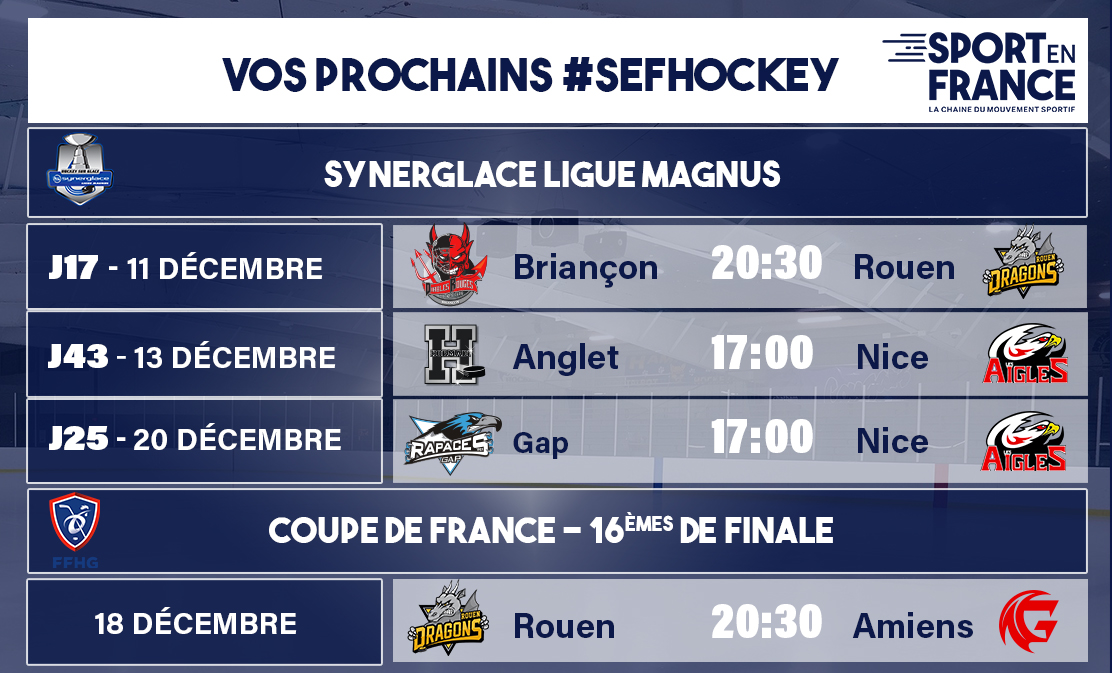 Du vendredi 11 au dimanche 20 décembre, le hockey-sur-glace sera fortement à l’honneur sur Sport en France. Trois rencontres de Synerglace Ligue Magnus et une affiche des 16èmes de finale de Coupe de France seront au programme de la chaîne du CNOSF.