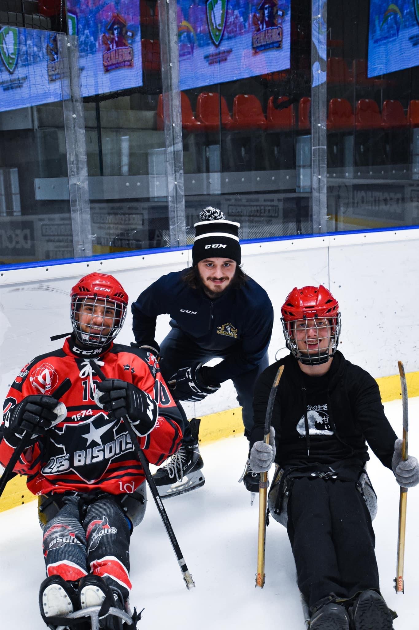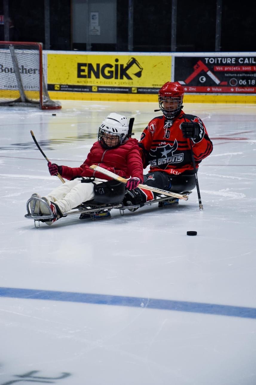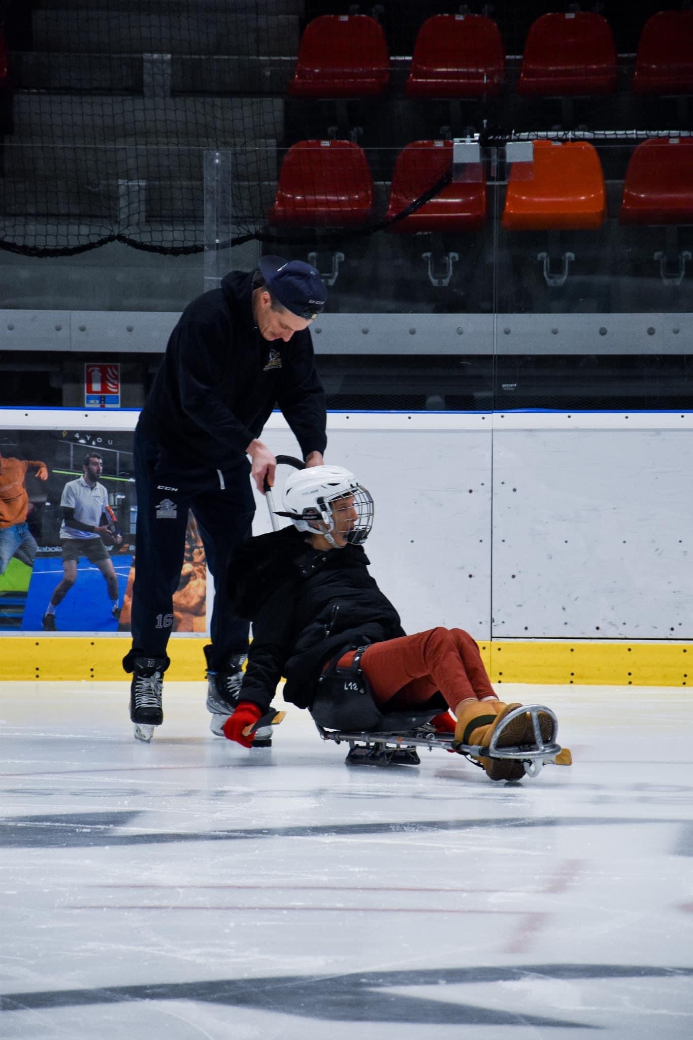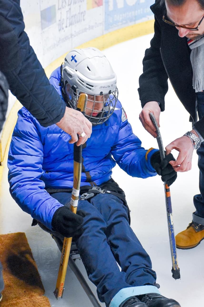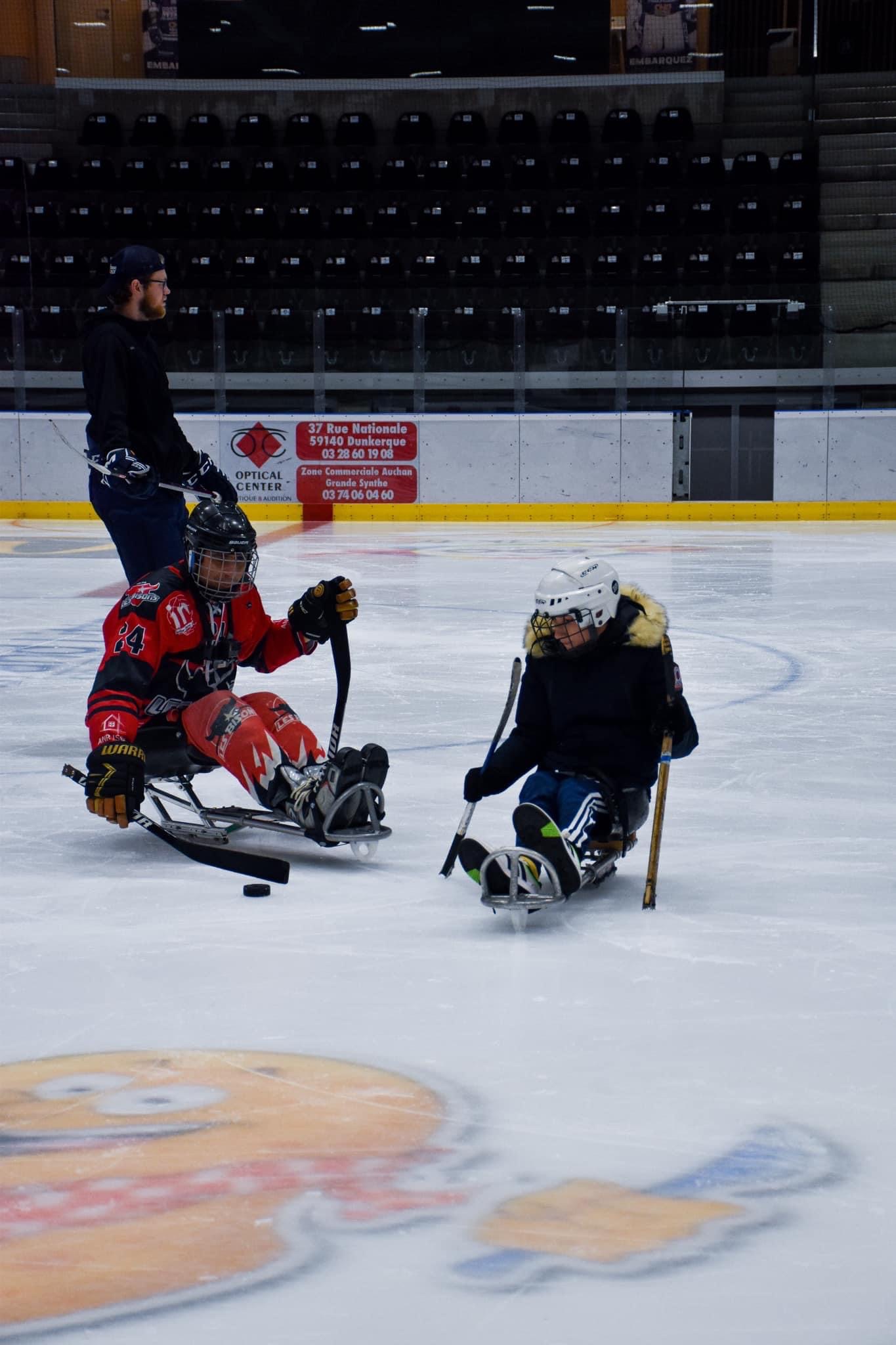 Pour cette première, François et Jérémy, joueurs de l’Equipe de France para hockey sur glace étaient fiers de montrer à tous ces jeunes leur médaille de bronze ramenée de Bangkok en les accompagnant sur la glace. Pour l’occasion les joueurs de l’équipe première du Hockey Club de Dunkerque ainsi que Jonathan Lafrance encadraient les jeunes participants. Pendant deux heures, tous ont découvert la maîtrise de la glisse dans une luge, le maniement du palet avant de tester quelques shoots sur la cage.