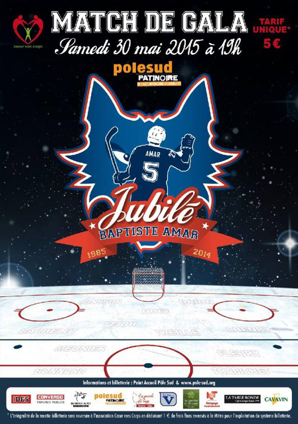 Un an après avoir mis un terme à sa carrière de joueur, Baptiste Amar va remonter sur la glace le samedi 30 mai 2015 à Pôle Sud pour effectuer son jubilé. Cette affiche de gala réunira un mélange d’anciens et d’actuels internationaux avec des joueurs marquant ou ayant marqué l’histoire des Brûleurs de Loups (Cristobal Huet, Laurent Meunier, Vincent Bachet, Eddy Ferhi,…). Cet événement possède un objectif caritatif puisque la billetterie sera entièrement reversée à l’association « Coeur vers Corps » (en déduisant 1€/ticket reversé à la Métro pour l’utilisation du système billetterie). Les billets pour cette rencontre amicale, mis en vente au tarif unique de 5€ (gratuit pour les – de 5 ans), sont disponibles à l’accueil de la patinoire Pôle Sud ou sur www.pole-sud.org. Le coup d’envoi du match est prévu à 19h : venez nombreux !