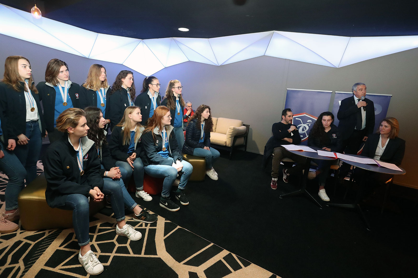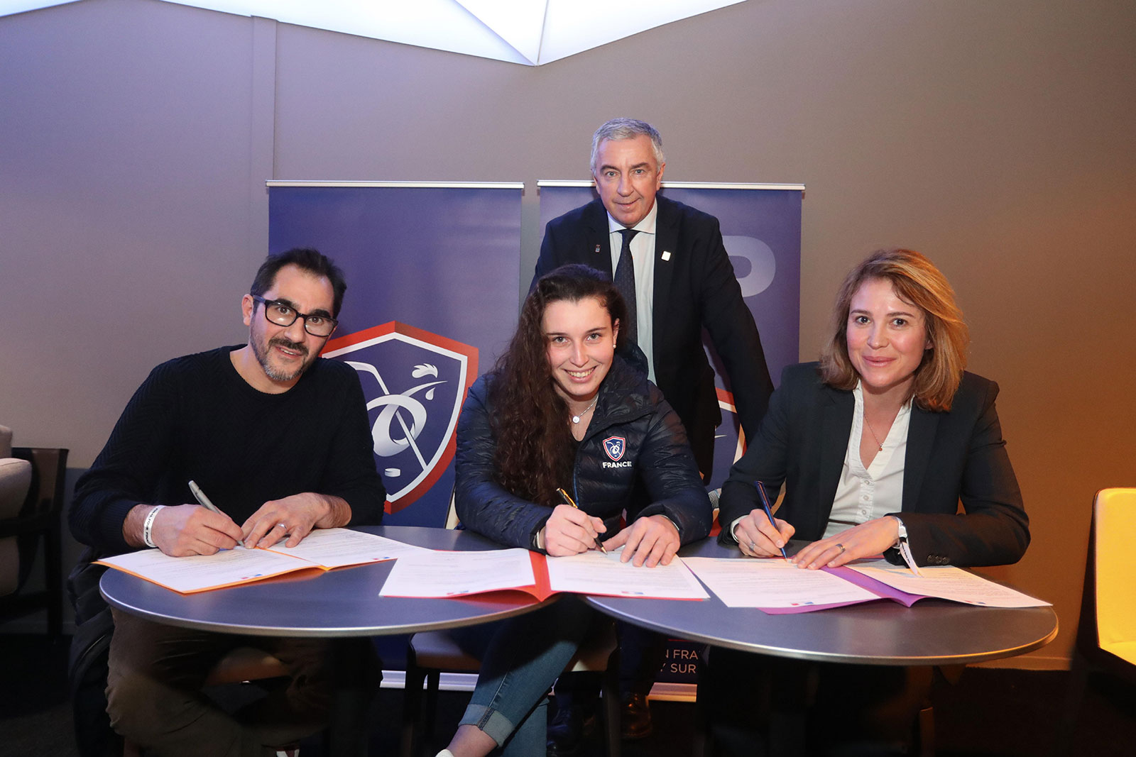 À l’occasion de la finale de Coupe de France ce dimanche 17 février, à l’AccorHotels Arena de Paris, une convention d’insertion professionnelle (CIP) a été signée entre Léa Parment, la crèche « Les Mininous » de Créteil représentée par son gérant Nicolas Costa et la Fédération Française de Hockey sur Glace, représentée par Christine Duchamp, Directrice Technique Nationale. Cet accord permettra à l’internationale tricolore de concilier sport de haut niveau avec son emploi d’auxiliaire de puériculture. Présent pour cette signature, Luc Tardif, Président de la FFHG, en a profité pour honorer les Bleuettes, qui avaient été invitées à l’événement. Il y a un peu plus d’un mois, les U18 françaises ont été sacrées Championnes du Monde D1B à Dumfries (SCO).