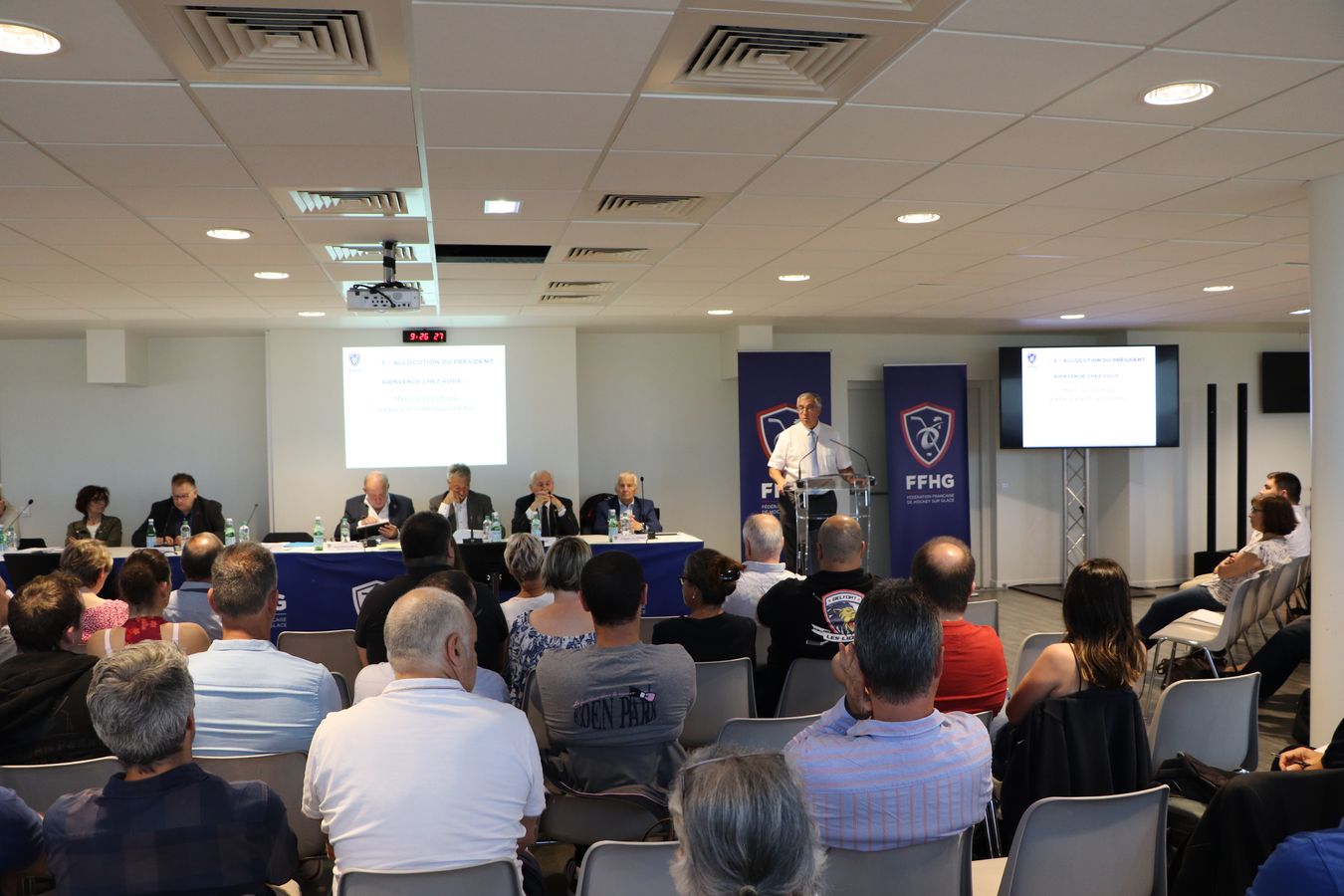 Dimanche, en ouverture d’Assemblée Générale, le Président de la FFHG Luc Tardif a pris la parole pour évoquer les nouveaux challenges de la FFHG, ses perspectives mais aussi pour rappeler sa volonté de continuer son « tour de France » des clubs, entamé l’année dernière. Il a également fait un bilan de la saison 2018-2019, rappelant que le sport nécessitait aussi de perdre et que l’important était d’être plus soudé que jamais dans cette année sportive plus difficile.