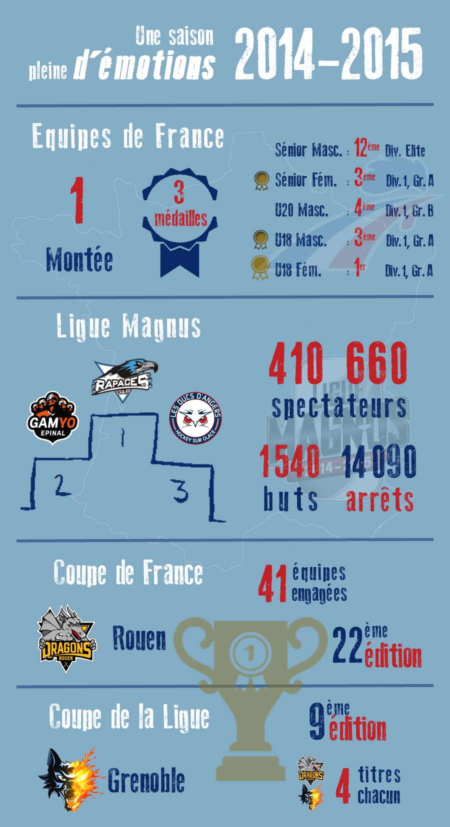Equipes de France, Ligue Magnus, Coupe de France, Coupe de la Ligue,… Comme d’habitude, la saison 2014-2015 du hockey sur glace français a été riche en événements ! Avec l’infographie ci-dessous, découvrez en quelques données les éléments à retenir de cette année.