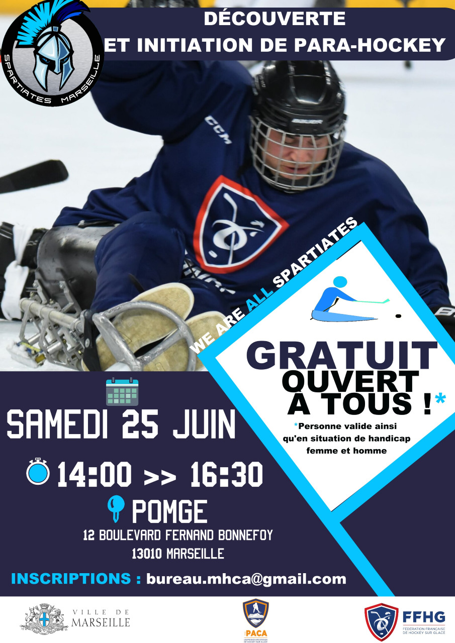 Les Spartiates de Marseille, en collaboration avec les Ligues AURA et SUD PACA, organisent une séance découverte du Para-Hockey le samedi 25 juin de 14h00 à 16h30 au Palais Omnisports de Marseille Grand-Est.