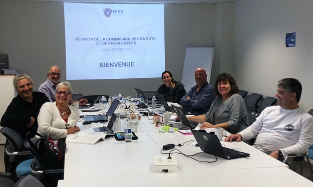 [caption id="attachment_31135" align="alignnone" width=""]De gauche à droite : Corinne Dogémont (Comité Directeur), Gilles Durand (membre CSR), Jean-David Camus (Secrétaire général), Prune Rocipon (FFHG), Axel Escalle (FFHG), Agnès Gibier (FFHG), Alain...