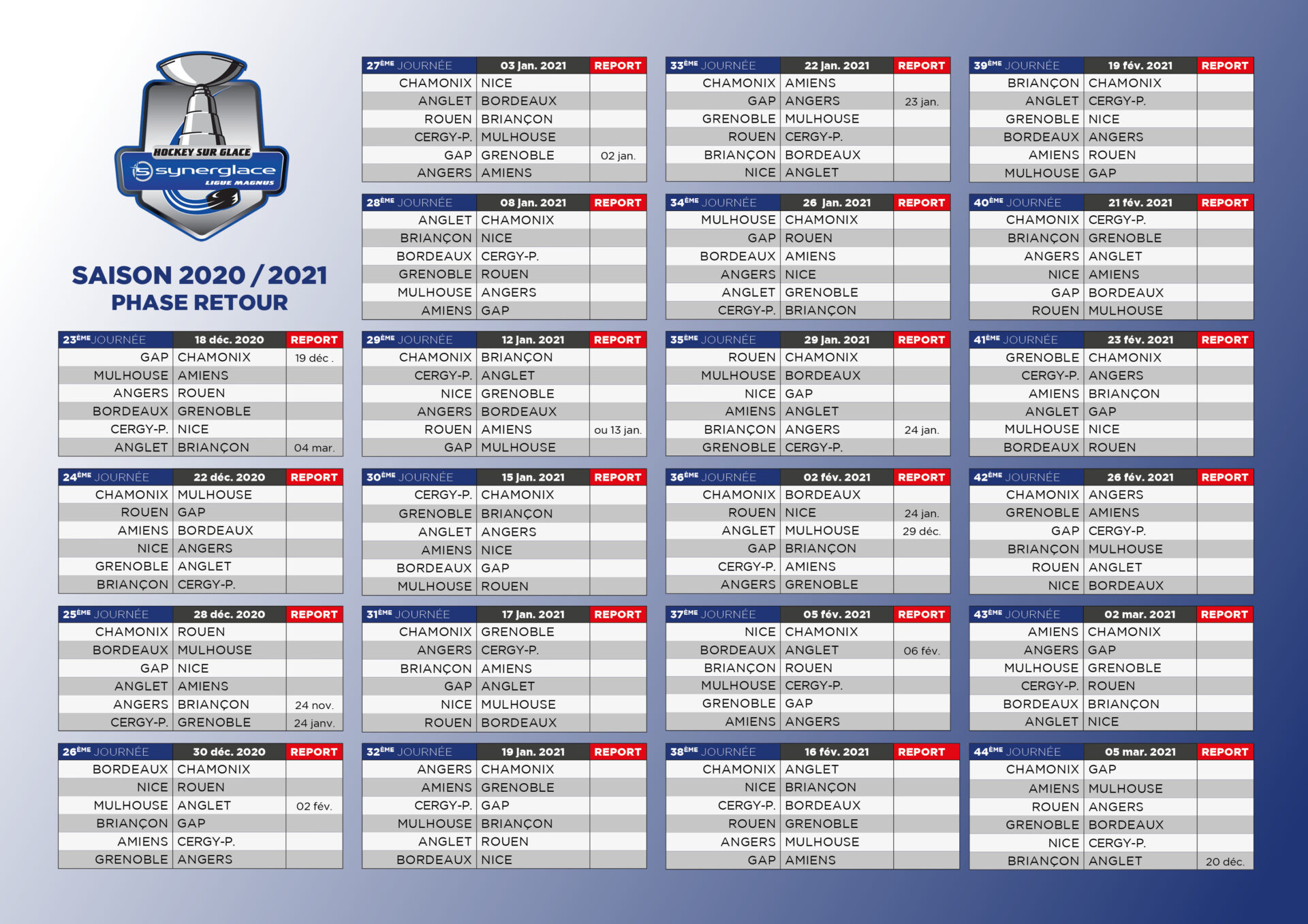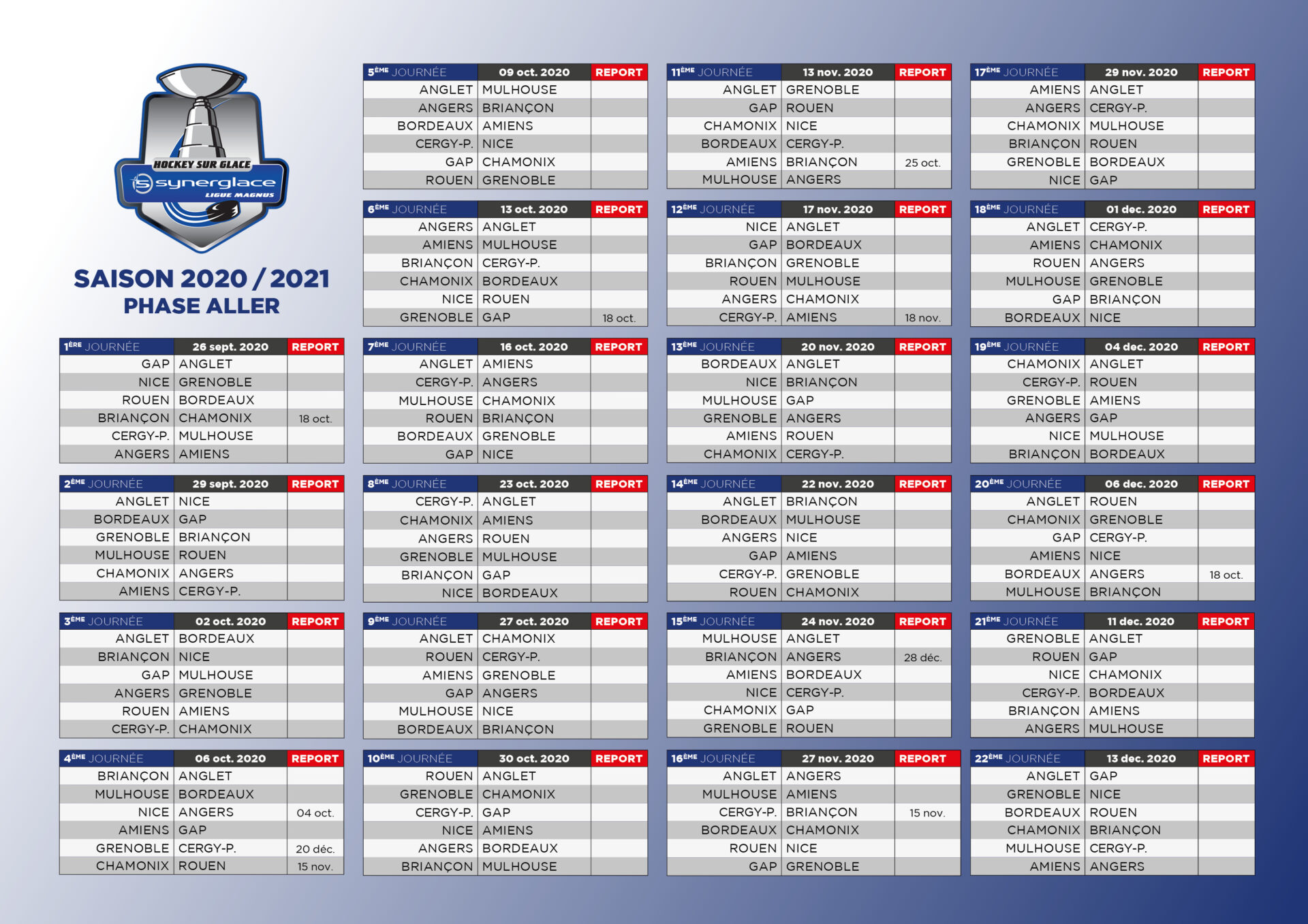 Le championnat de Synerglace Ligue Magnus débutera le samedi 26 septembre par des rencontres à La Barre, Jean Bouin, l’Ile Lacroix, l’Aren’Ice et l’Angers Iceparc. Le vainqueur de la saison régulière 19/20 Grenoble débutera son championnat sur la glace de Nice. Promu, Cergy-Pontoise jouera son premier match à ce niveau contre les Scorpions de Mulhouse. La 22ème journée marquant la mi-championnat se jouera le 13 décembre tandis que la 44ème et dernière journée est prévue le vendredi 5 mars.