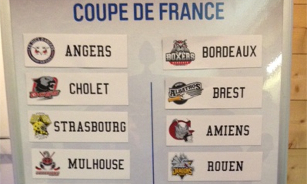 Le tirage au sort des 8èmes de finale de la Coupe de la France a été effectué ce samedi soir par Luc Tardif, Président de la FFHG, en marge de la rencontre de Ligue Magnus opposant Chamonix au HCMAG. Le tenant du titre, Angers, recevra ainsi Bordeaux, pensionnaire de D1. Les 2 autres formations de D1 encore qualifiées joueront, elles, à domicile. Les Dogs de Cholet accueilleront les Albatros de Brest et les Scorpions de Mulhouse affronteront les Dragons de Rouen, finalistes la saison passée. Retrouvez ci-dessous l’intégralité des affiches qui auront lieu le mardi 18 novembre 2014.