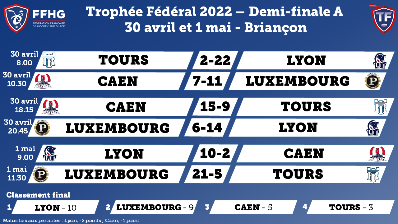 Lyon a remporté, ce week-end, le premier des quatre tournois de demi-finale du Trophée Fédéral 2022 à Briançon. Lyon et Luxebourg ont respectivement battu Tours (22-2) et Caen (11-7) lors des deux rencontres du samedi matin. Caen a ensuite remporté le 3ème match du week-end face à Tours (15-9). La quatrième rencontre entre Lyon et Luxembourg s’annonce alors comme la finale du tournoi. Une finale parfaitement entamée par les Puckers (1-4 à l’issue de la première période) avant que la machine Rhodanienne ne se mette en marche et inflige aux Luxembourgeois un sévère 8-0 dans le deuxième tiers. Au final, Lyon s’impose 14-6 et vire en tête à l’issue de la journée de samedi. Il ne reste donc plus aux Lyonnais qu’à conclure face à Caen dimanche matin pour remporter le tournoi. C’est chose faite sur le score de 10-2. Dans la dernière rencontre du week-end, Luxembourg assure la 2ème place en battant Tours 21-5. Lyon est donc le premier qualifié pour la finale du Trophée Fédéral qui se déroulera à Meudon les 14 et 15 mai.