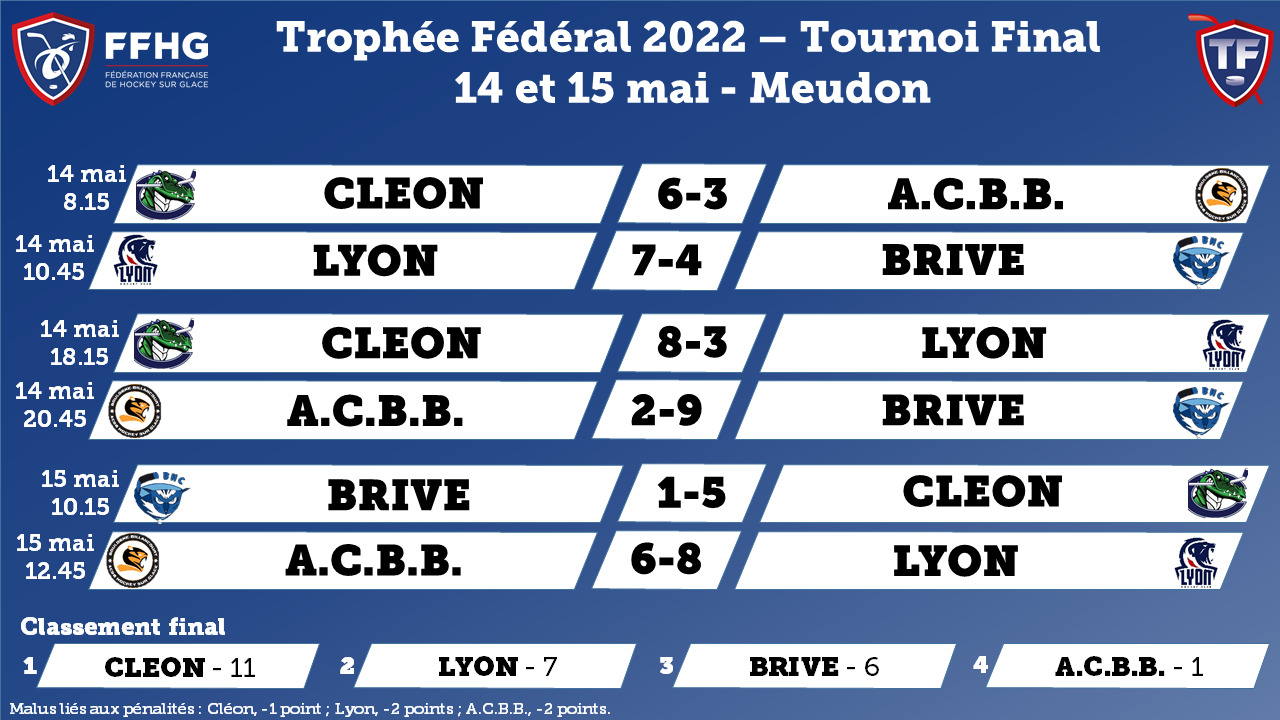 La rencontre entre les deux équipes a lieu dimanche matin. Elle est équilibrée jusqu’à la mi-match (2-1) mais Cléon fait le break dans les derniers instants de la deuxième période et s’impose 5-1 au final. Les Crocodiles s’assurent ainsi de remporter son second Trophée Fédéral, après celui de 2017. Le dernier match du tournoi devait décidé de la suite du podium. Longtemps indécise, cette dernière rencontre a fini par basculer du côté des Lyonnais (8-6) qui s’assurent ainsi la médaille d’argent. Brive termine à la troisième place, juste devant l’ACBB.