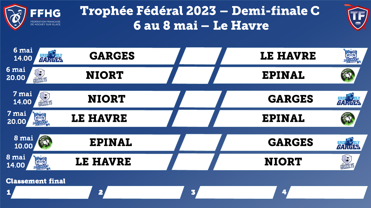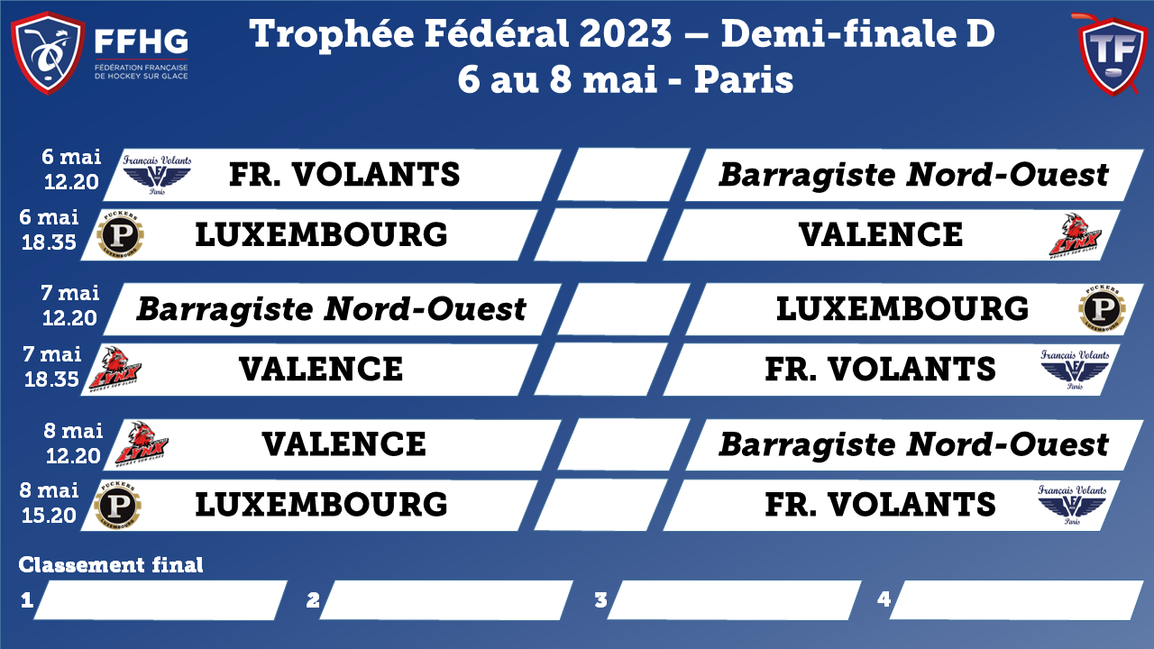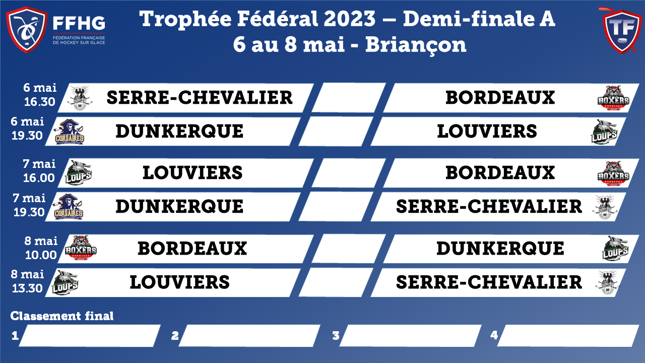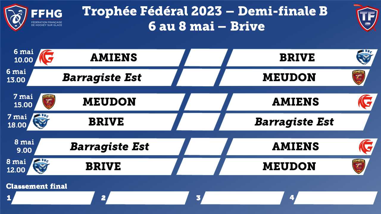 Les demi-finales du Trophée Fédéral se disputeront pour la première fois toutes le même week-end et toutes sur 3 jours à Brive, au Havre, à Paris et à Briançon. Voici les programmes de ces quatre tournois.