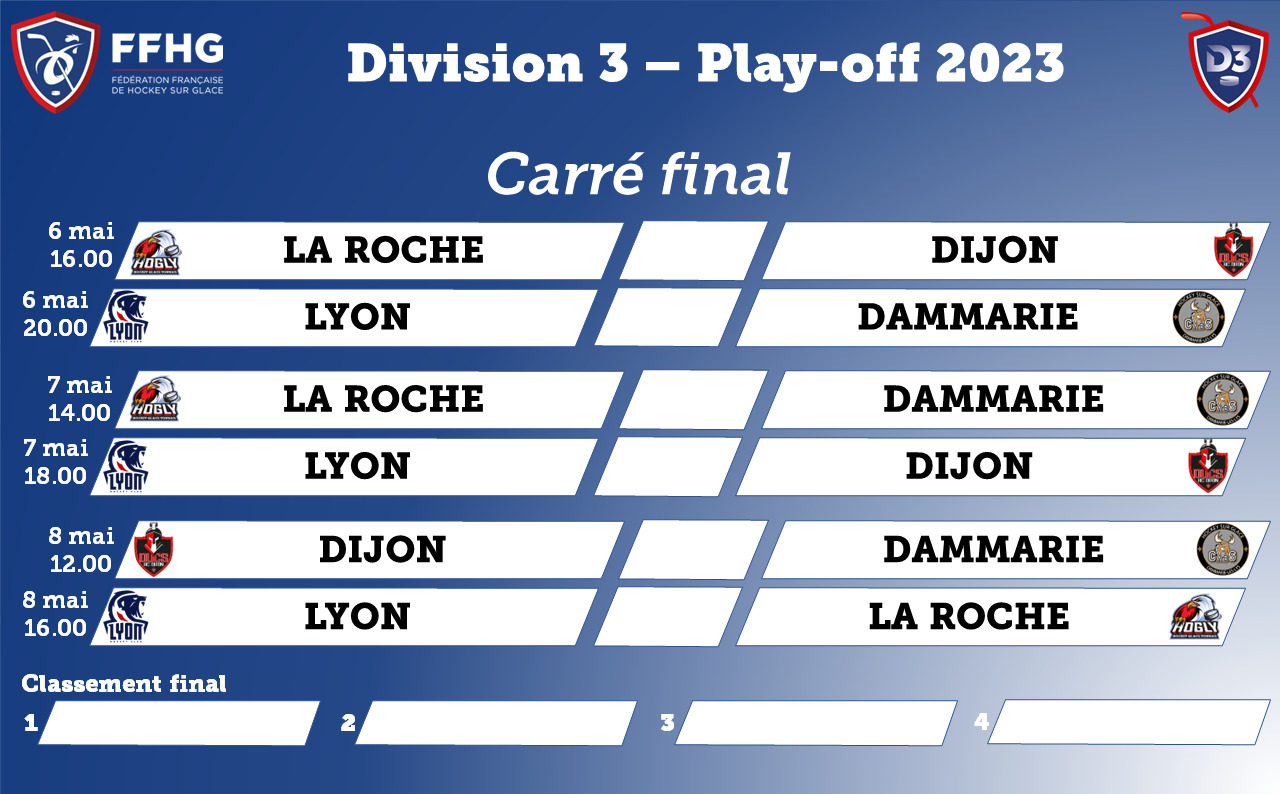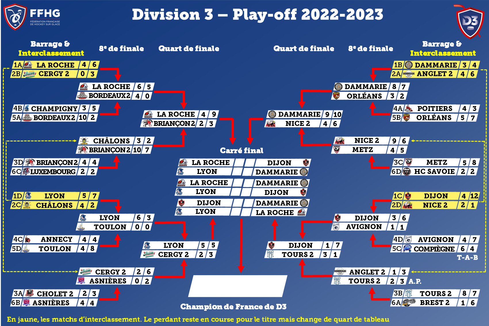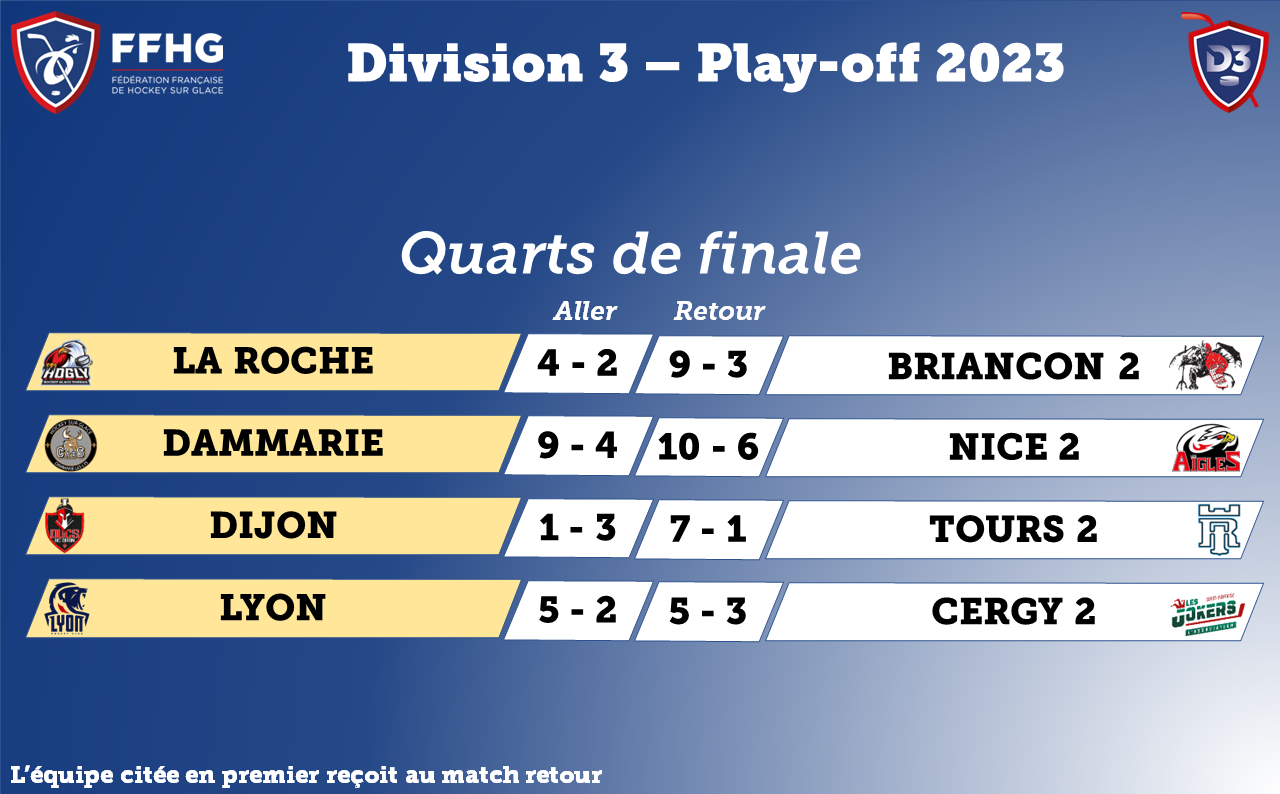 Vainqueurs de Nice 2 à domicile (10-6), les Caribous de Dammarie-lès-Lys ont validé leur qualification pour le carré final, qui affronteront dans plusieurs jours les Lions de Lyon, tombeurs de Cergy-Pontoise 2 (5-3). De son côté, Hogly s’est défait de Briançon 2 en remportant la deuxième manche sur le score de 9-3. Enfin, Dijon a réussi à renverser la tendance contre Tours avec une victoire 7-1 à l’occasion du match retour.