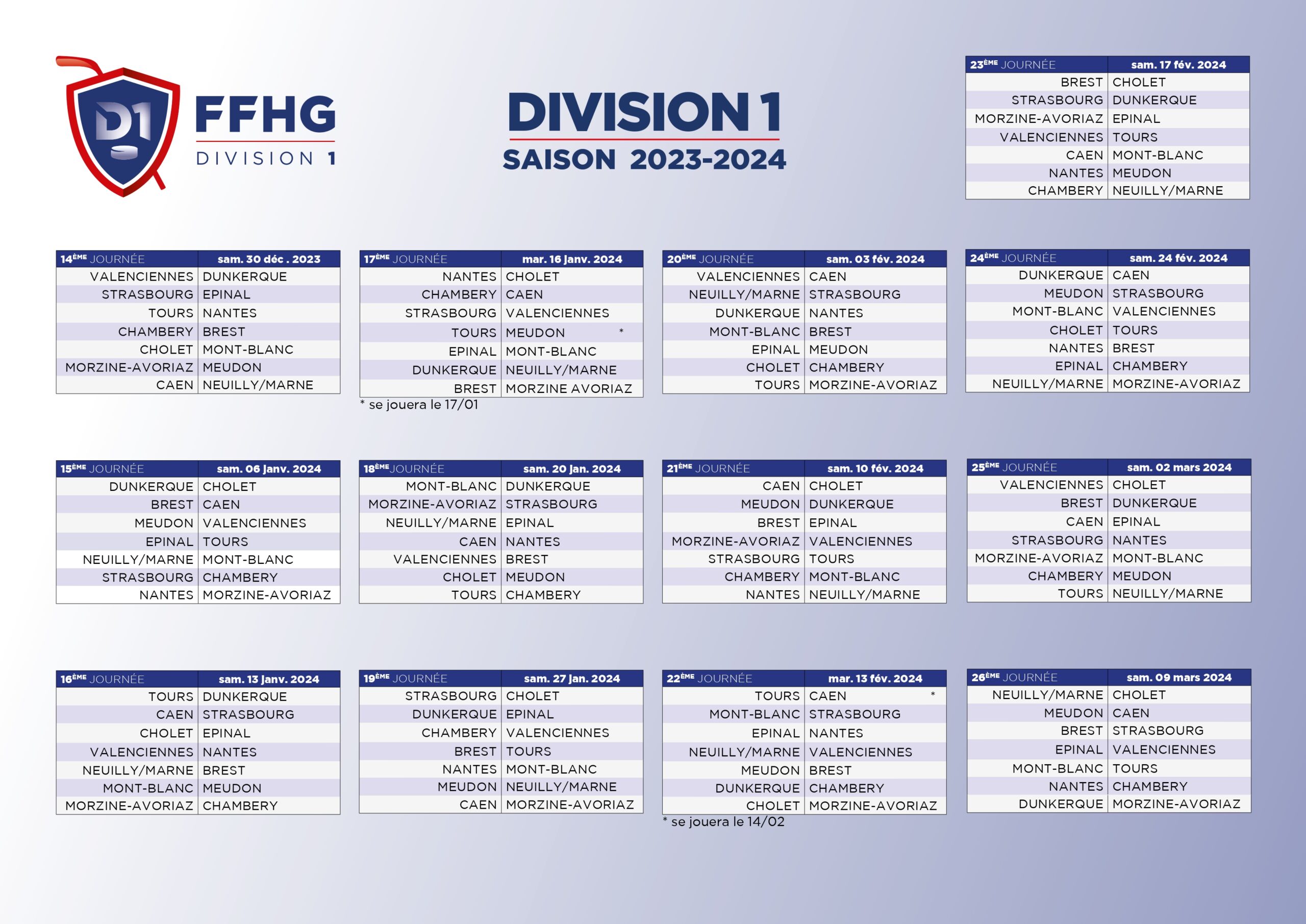 Calendrier prévisionnel sous réserve de la validation de Nantes en Division 1 par la CNSCG et des modifications demandées par les clubs et qui seraient validées par la FFHG.