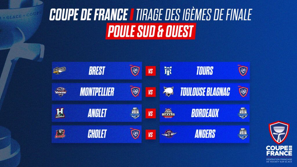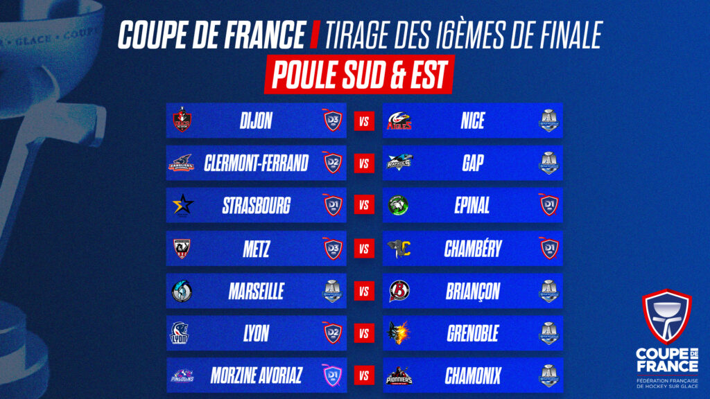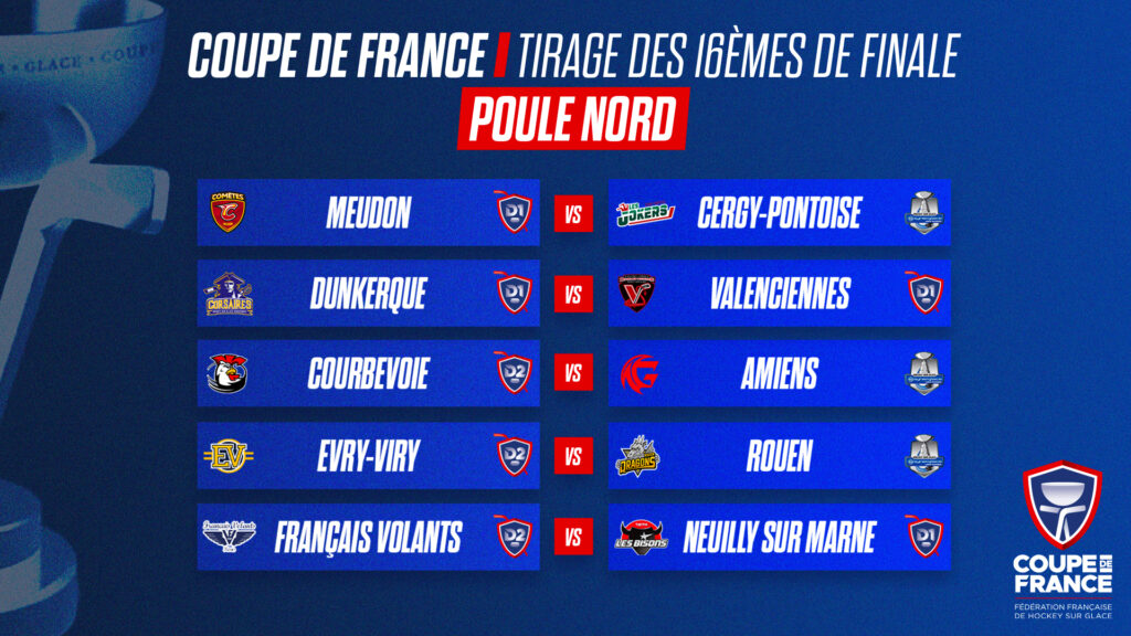 Découvrez le tirage au sort complet des 16èmes de finale de Coupe de France, effectué à l’Aren’Ice de Cergy-Pontoise ce vendredi 6 octobre par Benjamin Turlure (Coordinateur Suivi & Performance au CES de Cergy-Pontoise) et Luc Mainfray, responsable de la compétition. Les matchs auront lieu les 24 et 25 octobre.