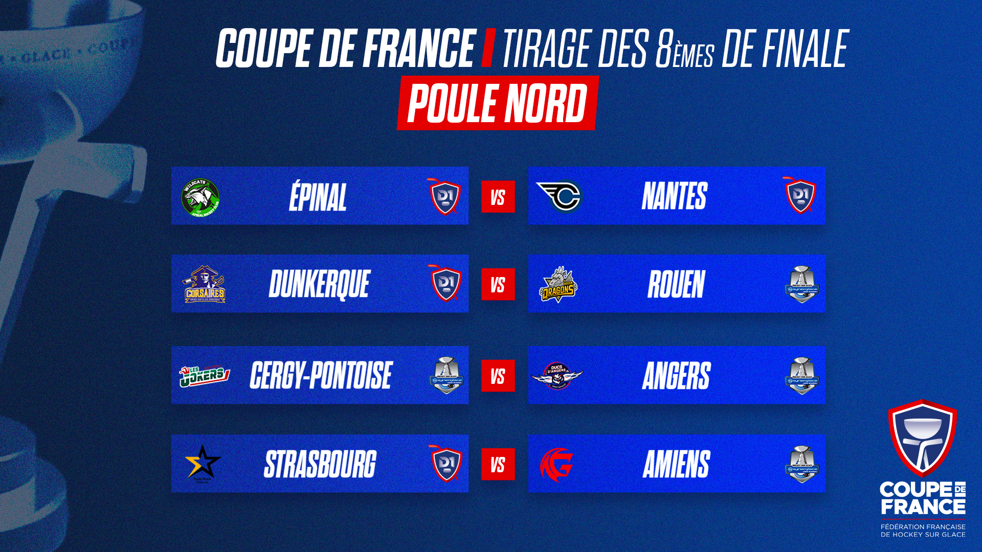 Dans la poule Nord, un gros choc aura lieu entre deux équipes de Synerglace Ligue Magnus. En effet, à l’Aren’Ice, les Jokers de Cergy-Pontoise affronteront les Ducs d’Angers, leaders du championnat. Après le choc de SLM, une rencontre entre deux équipes de Division 1. En forme depuis le début de saison, les Wildcats Epinal recevront les Corsaires de Nantes, tous deux sont victorieux à trois reprises sur les quatre premières rencontres de D1.