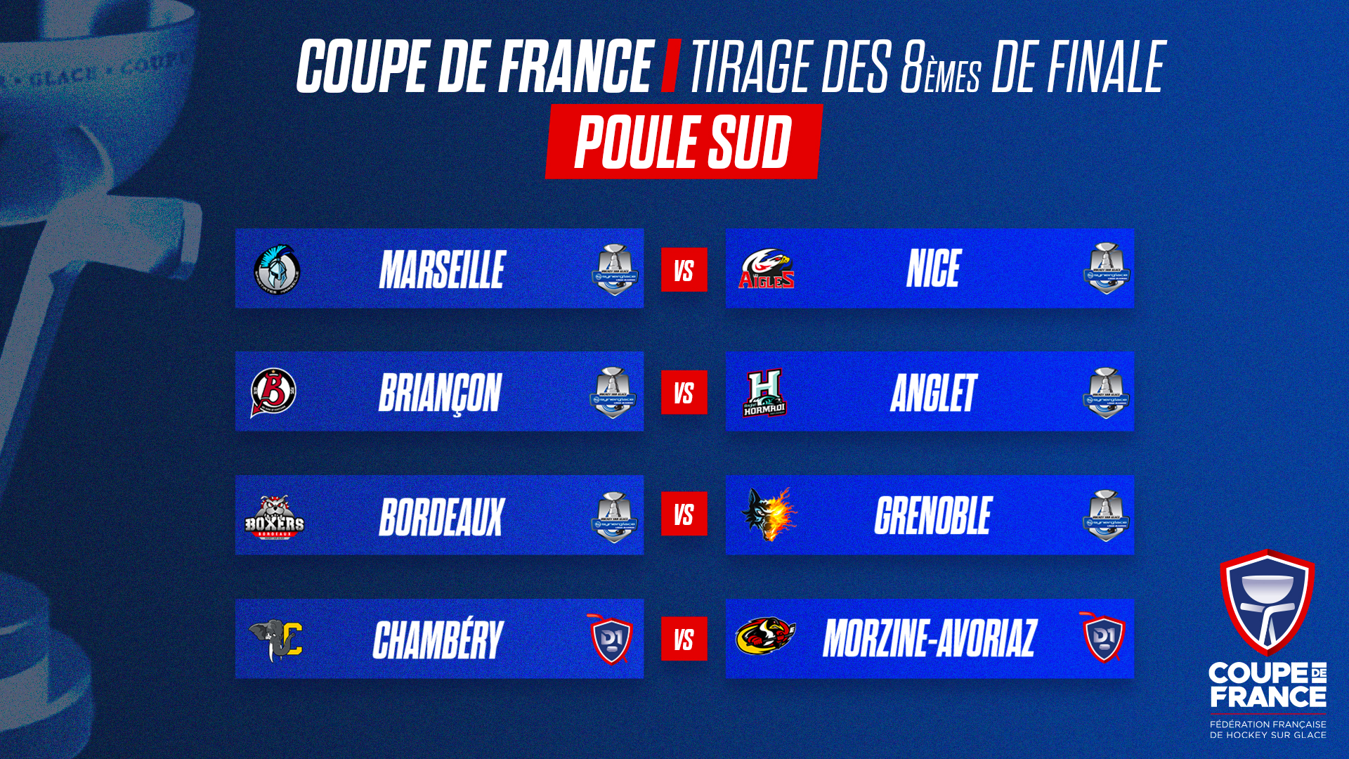 Elle sera certainement l’affiche de ces 8èmes de finale ! Vainqueur de la Coupe de France lors des deux dernières éditions, Grenoble se déplacera à Bordeaux, finaliste du dernier championnat de France. En Provence-Alpes-Côte d’Azur, un nouveau derby aura lieu entre les Spartiates de Marseille et les Aigles de Nice. Victorieux de leurs voisins gapençais au tour précédent, les Diables Rouges de Briançon recevront l’Hormadi Anglet, autre équipe de Magnus. Enfin, un deuxième club de D1 sera assuré de jouer les quarts de finale avec une rencontre entre deux équipes de cette division : Chambéry et Morzine-Avoriaz.