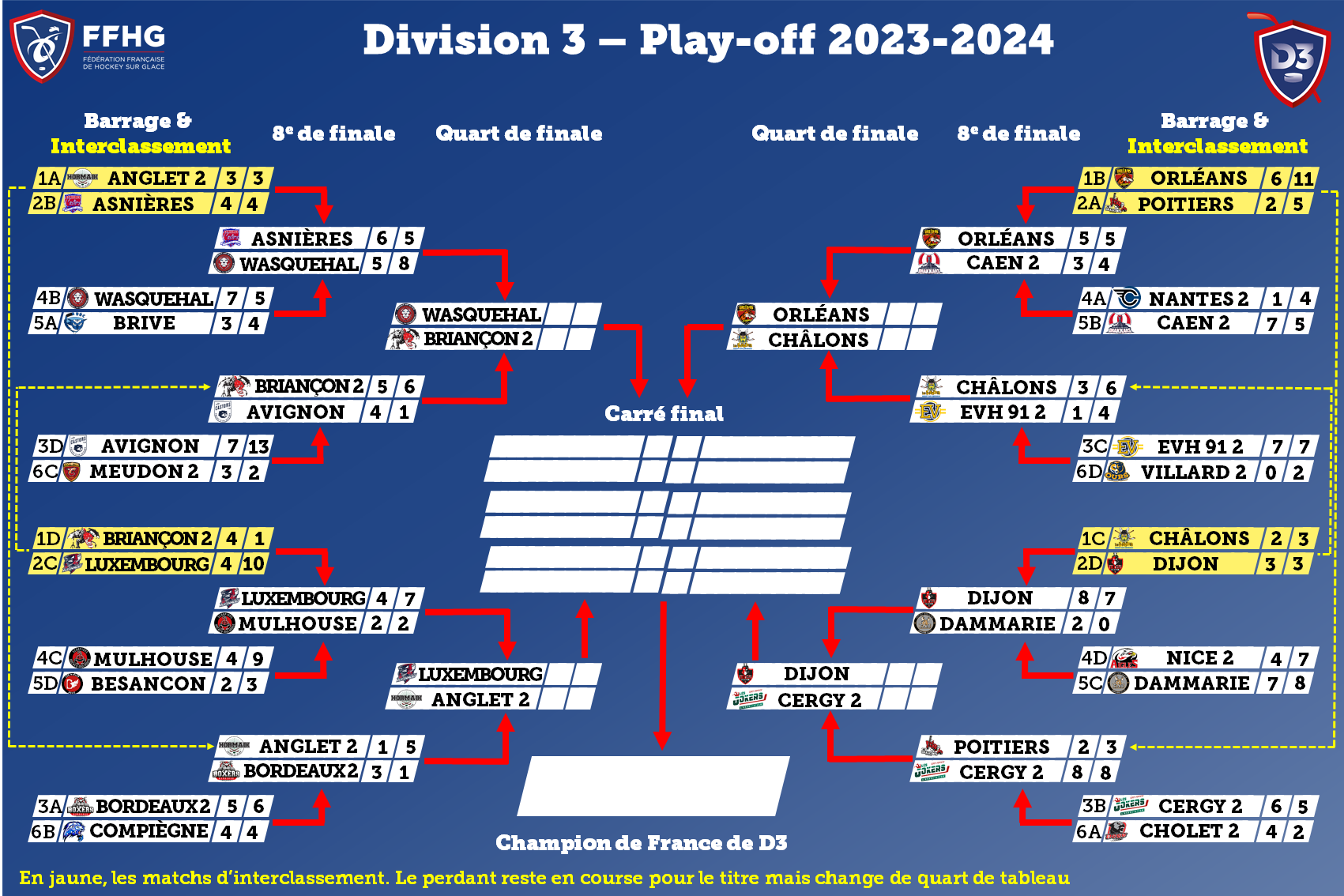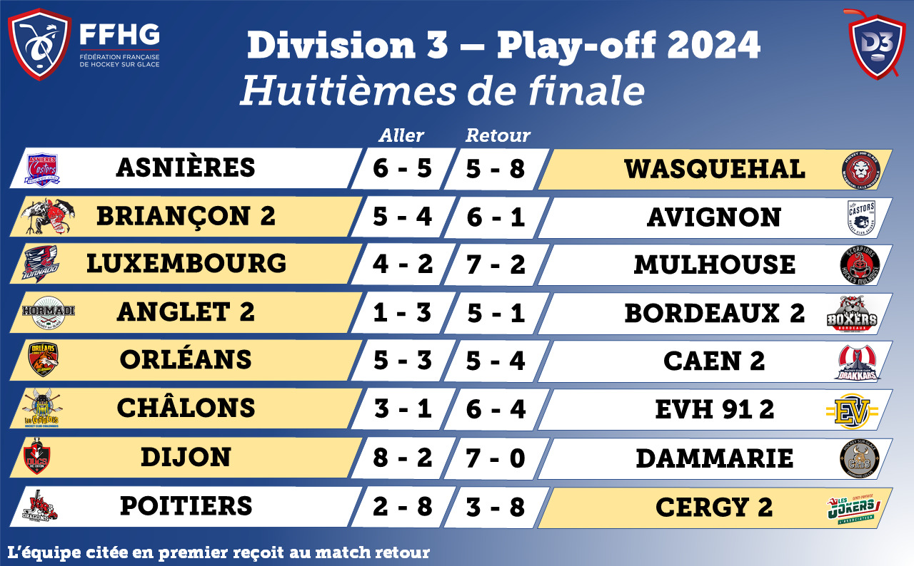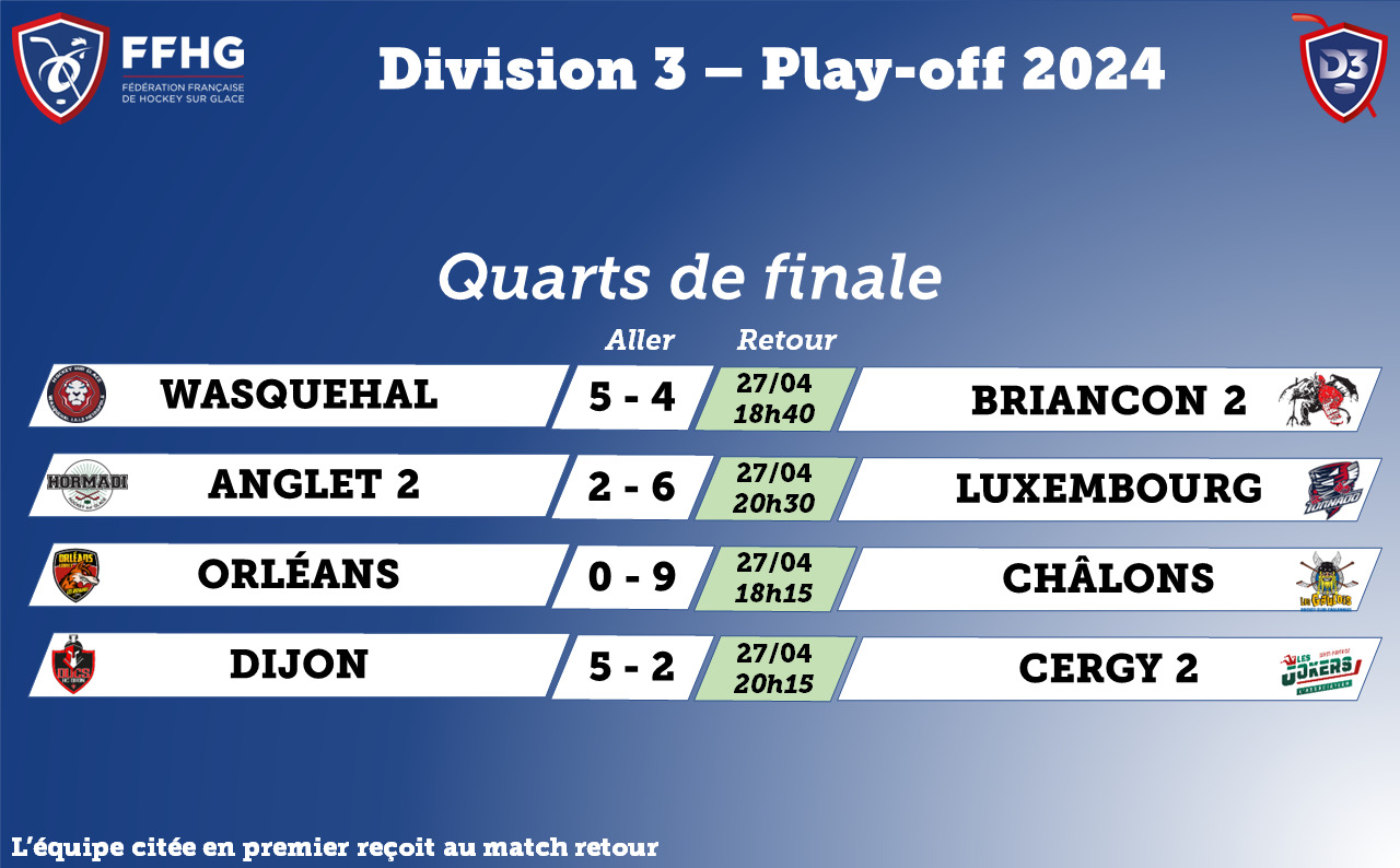 Pas de surprise ce week-end en Division 3 puisque les équipes s’étant imposées au match aller, se sont qualifiées. Ainsi, Wasquehal, Luxembourg, Châlons-en-Champagne et Dijon composent le carré final...